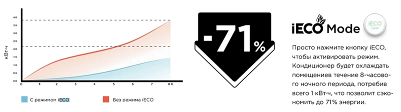 - Функция iECO — мгновенно обеспечит ваш дом комфортной температурой и поддержит ее, сокращая потребление энергии за счет новаторской технологии управления альфа-алгоритмов. Удобно использовать, как ночной режим.