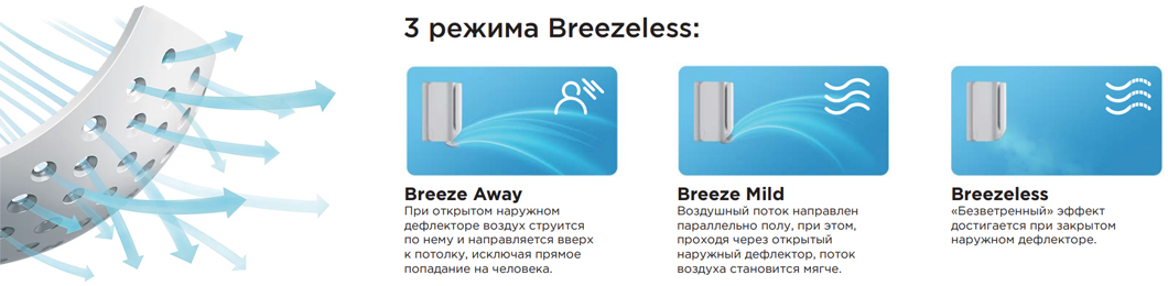 Технология Breezeless — несколько тысяч мини-отверстий сконструированы с целью устранения неприятного воздействия холодного воздуха из блока, которое вы совершенно не почувствуете. Каждое отверстие задает свое направление воздушному потоку, сглаживая его и делая идеально мягким. Три режима рассеивания воздуха, делают воздушный поток максимально комфортным и прохладным.