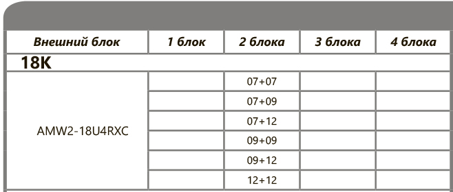Рассчитан на подключение 2 внутренних блоков. Общая площадь охлаждения до 50 кв.м, комбинации внутренних блоков подбираются индивидуально. Внутренние блоки можно подобрать здесь.