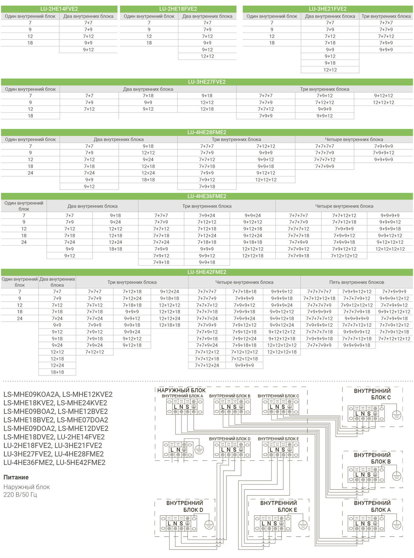 При подключении нескольких внутренних блоков, суммарная производительность которых превышает номинальную мощность наружного блока, при одновременной эксплуатации каждый из них будет работать со сниженной производительностью. Такой вариант подключения допускается в случае, когда внутренние блоки используются не одновременно (например, ночью – спальня, днем – гостиная).