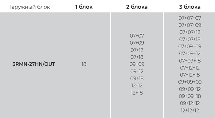 Общая площадь охлаждения до 75 кв.м, комбинации внутренних блоков подбираются индивидуально.