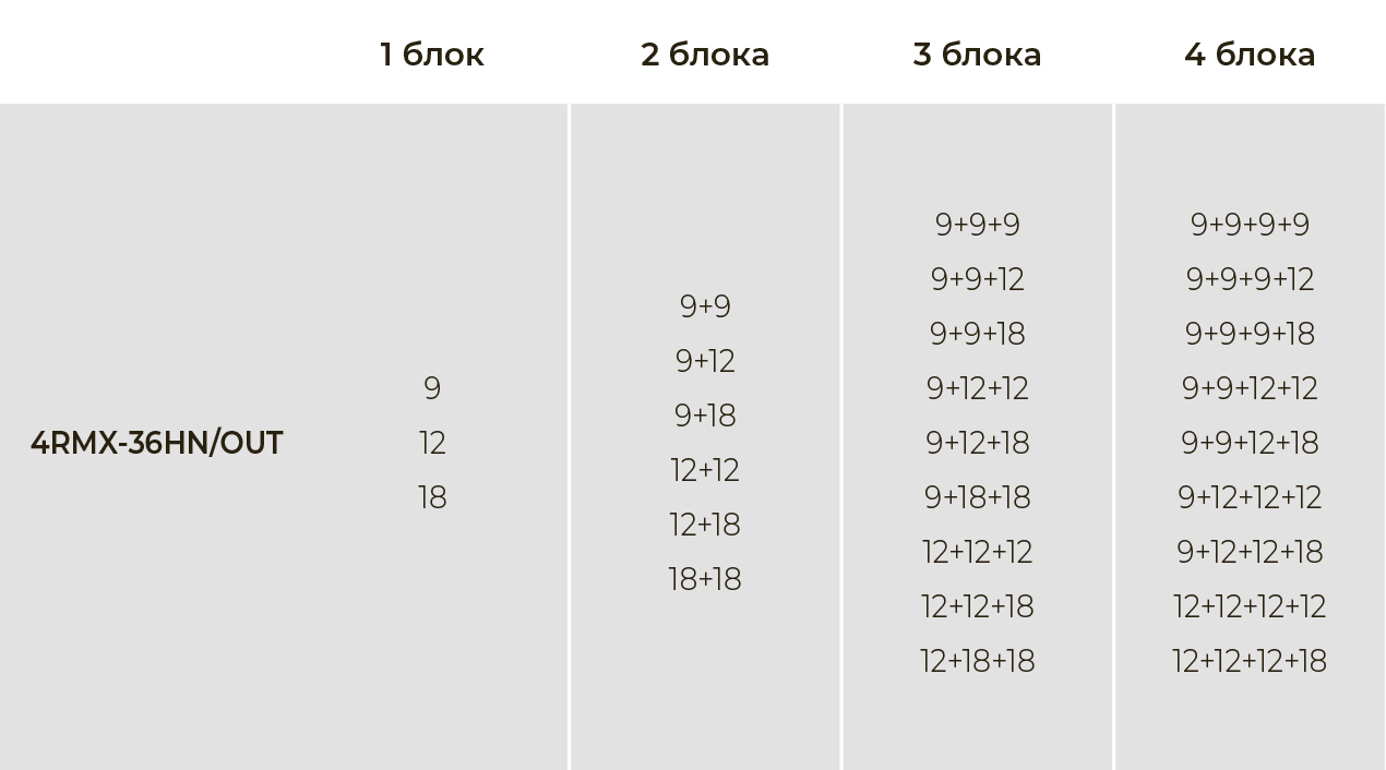 Общая площадь охлаждения до 100 кв.м, комбинации внутренних блоков подбираются индивидуально.