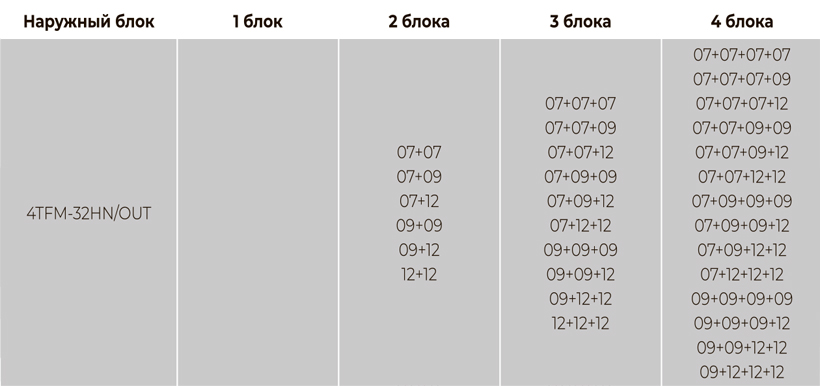 При подключении нескольких внутренних блоков, суммарная производительность которых превышает номинальную мощность наружного блока, при одновременной эксплуатации каждый из них будет работать со сниженной производительностью. Такой вариант подключения допускается в случае, когда внутренние блоки используются не одновременно (например, ночью – спальня, днем – гостиная).