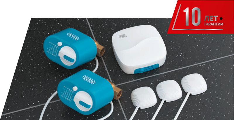 - Полный комплект для защиты. В коробке есть всё необходимое: модуль управления, 2 крана с приводом 12В, 3 датчика протечки с соединительными кабелями и терминатор для контроля линии.