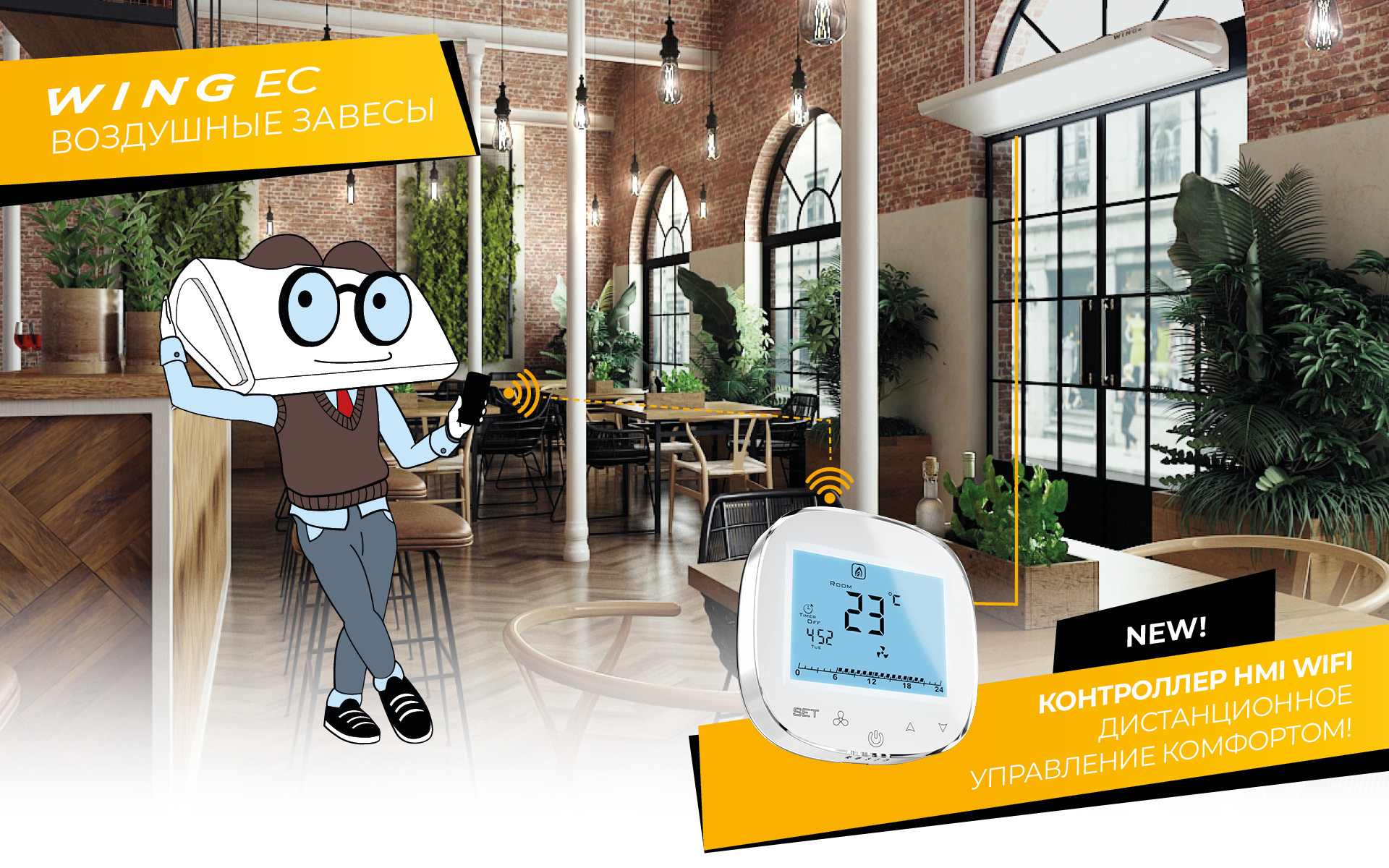 Предназначен для управления всеми завесами WING, имеющими EC двигатель. Обеспечивает плавное регулирование частоты вращения двигателей EC, а также управляет работой в режимах обогрева, охлаждения и вентиляции.
