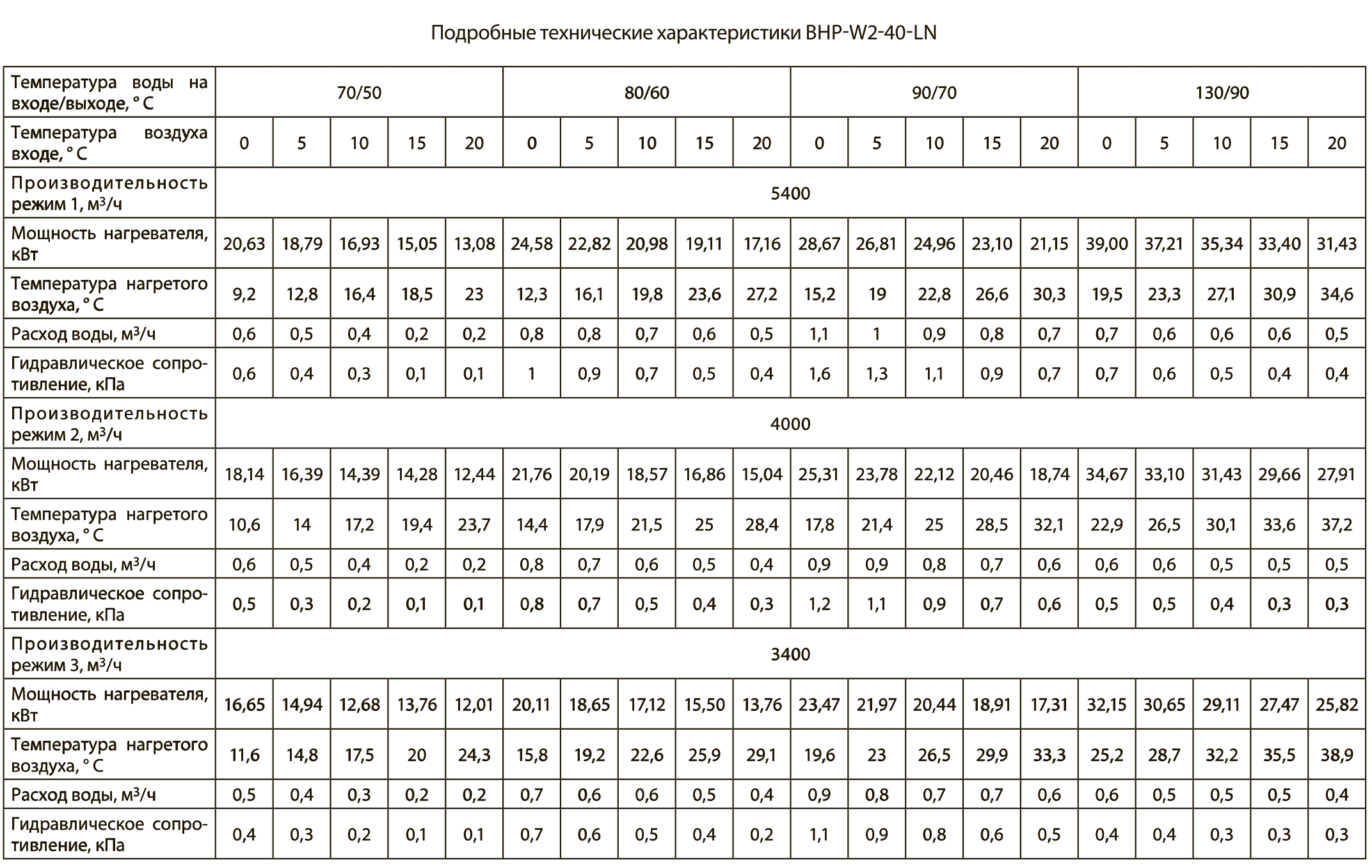 Тепловые характеристики приведены при температуре воздуха на входе +0 °С, максимальном расходе воздуха и максимальной температуре теплоносителя (указанной в таблице тепловой мощности от производителя).