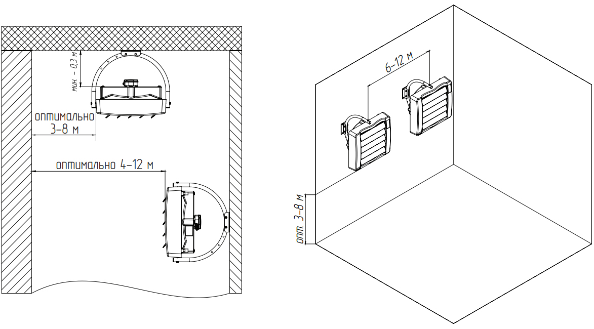 Варианты размещения при настенном монтаже: