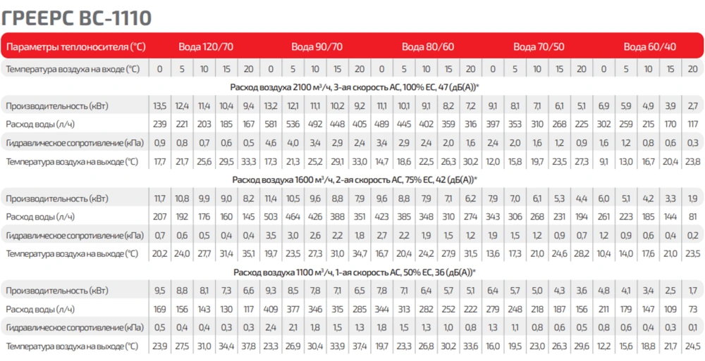 Тепловые характеристики приведены при температуре воздуха на входе +0 °С, максимальном расходе воздуха и максимальной температуре теплоносителя (указанной в таблице тепловой мощности от производителя).