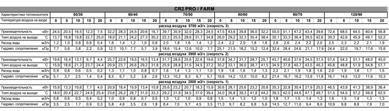Тепловые характеристики приведены при температуре воздуха на входе +0 °С, максимальном расходе воздуха и максимальной температуре теплоносителя (указанной в таблице тепловой мощности от производителя).