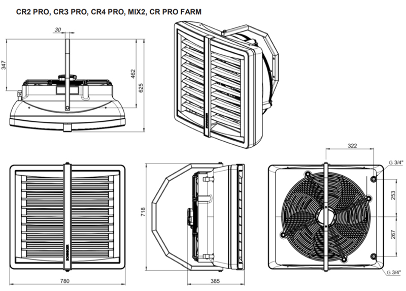 Тепловентиляторы CR устанавливаются на стенах или потолке с помощью монтажных кронштейнов под углом 90°, 60° или 30°в вертикальной плоскости. Кронштейн позволяет поворачивать агрегат в горизонтальной плоскости на угол до 78° в одну сторону, и до 50° в другую, сохраняя достаточное пространство для подключения к теплосети.