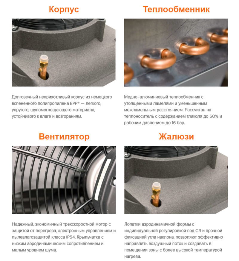 Тепловентиляторы Sonniger CR нового поколения, благодаря увеличенному размеру ребер теплообменника и уменьшенному расстоянию между ними, обеспечивают еще большую ΔT° и эффективно работают на всех скоростях вентилятора.