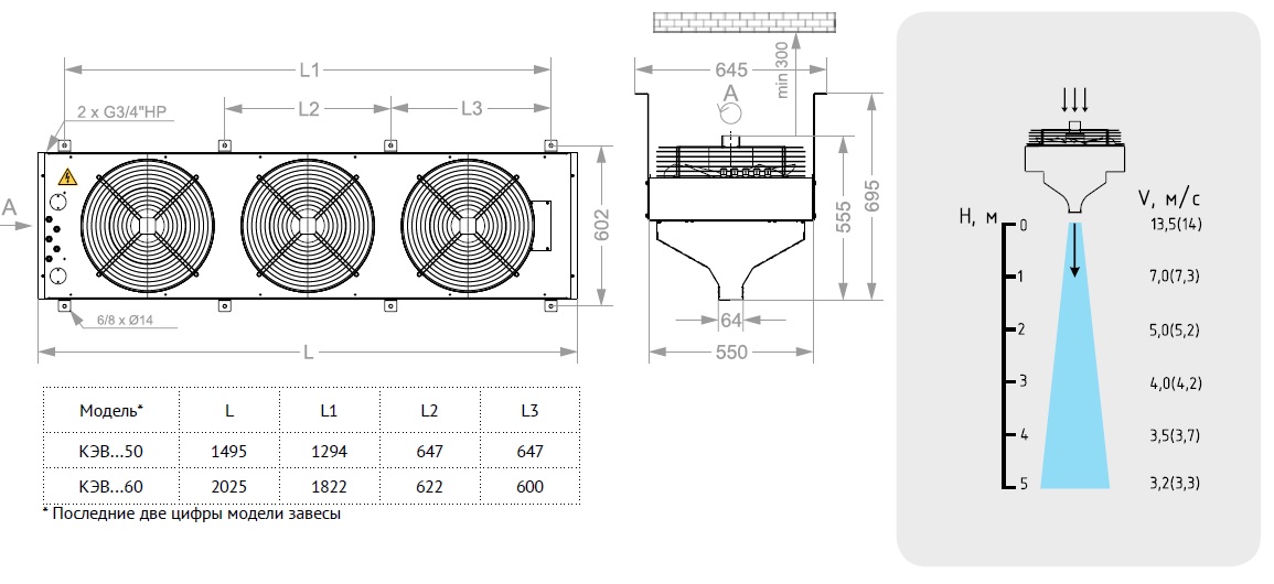 Эффективная длина струи может служить оценкой допустимой ширины или высоты проема, который защищает завеса. При вертикальной установке завес с двух сторон проема, значение, следует понимать как полуширину. Параметр указан только для "мягких" наружных условий, т.е. температура воздуха не опускается ниже 0 °С, а скорость ветра не превышает 1м/с, приточно-вытяжная вентиляция сбалансирована. Любое ужесточение условий уменьшает эффективную длину струи на 50%.