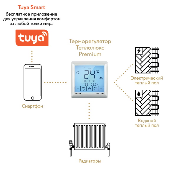 Управление осуществляется через сеть Wi-Fi с помощью приложения Tuya Smart — бесплатного приложения для управления комфортом из любой точки мира.