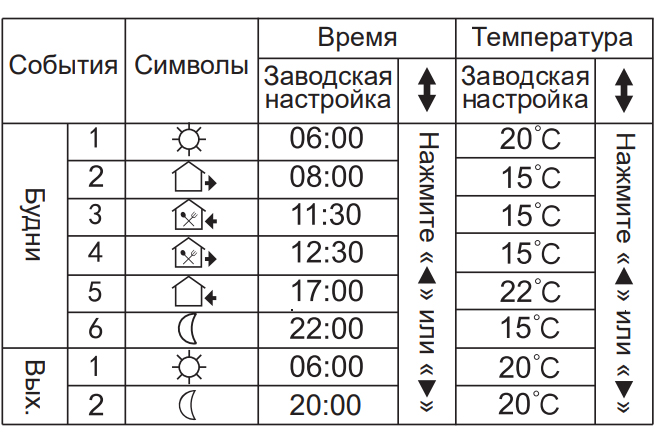 - Временно ручной режим — терморегулятор временно поддерживает заданную вручную температуру, к моменту следующего события возвращается к программным настройкам.