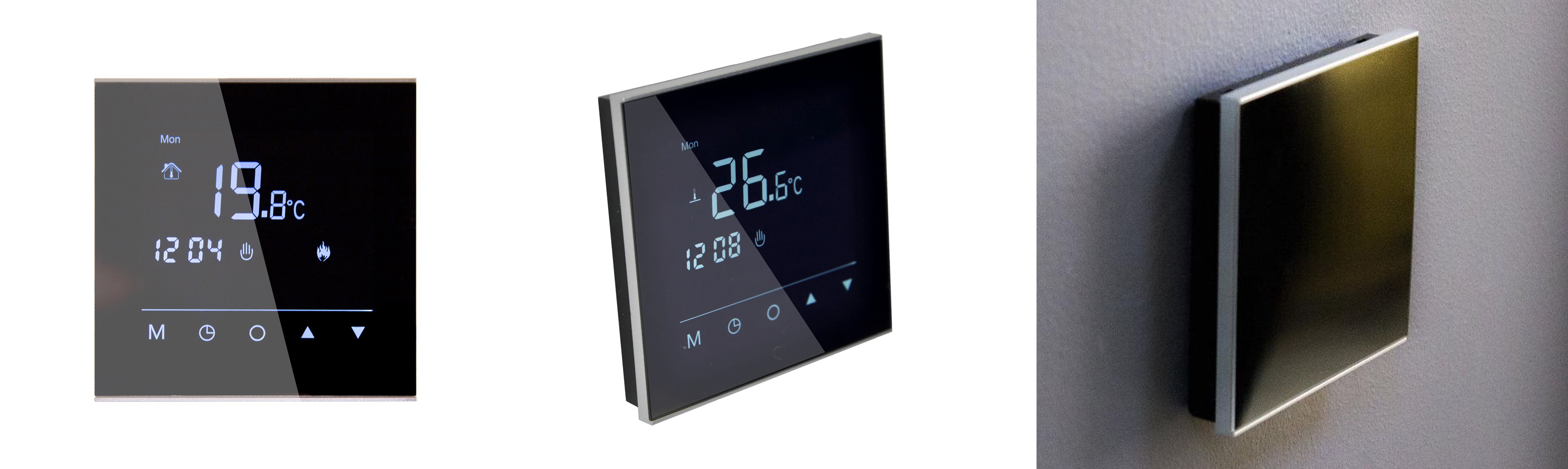 Стильный черный терморегулятор с сенсорным управлением и возможностью программирования работы. Применяется для управления системой электрообогрева полов. Работает как в ручном режиме, так и в режиме программирования.