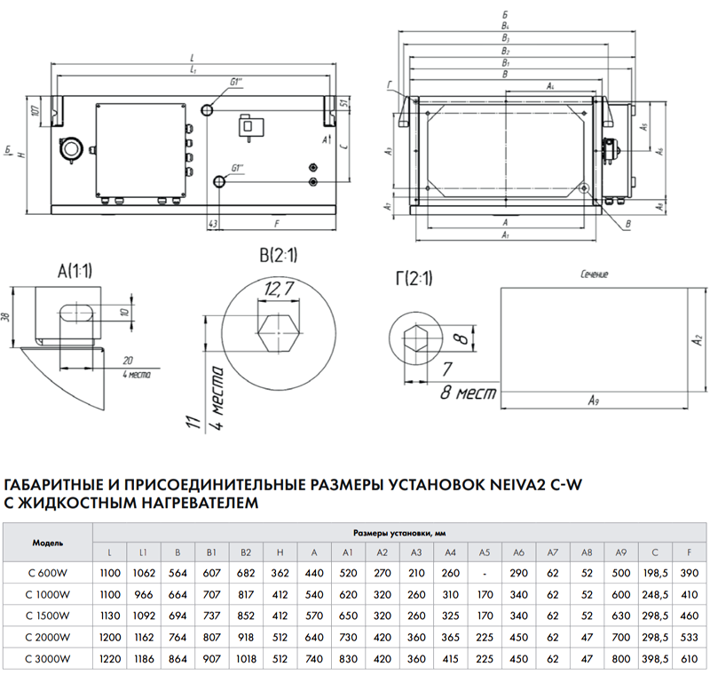 Жидкостный нагреватель представляет собой медноалюминиевый пластинчатый теплообменник, корпус которого выполнен из оцинкованного стального листа. Предусмотрены специальные резьбовые патрубки для удобства слива воды и обезвоздушивания теплообменника. Наличие узла регулирования (предусмотрен опционально) обеспечивает постоянное изменение мощности и защиту жидкостного нагревателя. Изменение мощности обеспечивается посредством изменения количества воды на входе при постоянном потоке воды. Для защиты нагревателя от обмерзания применяются капиллярный термостат и датчик температуры обратной воды.